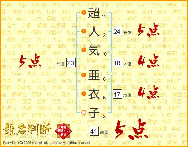超(12画)人(2画)気(10画) 亜(8画)衣(6画)子(3画)