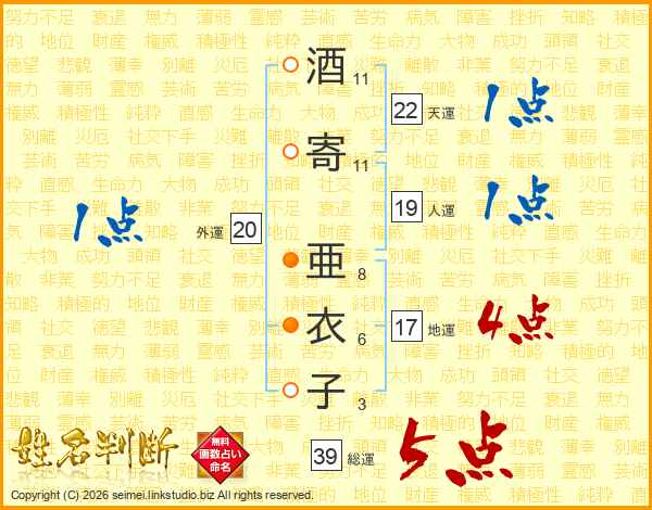 酒寄亜衣子さんの総運は39画の5点!