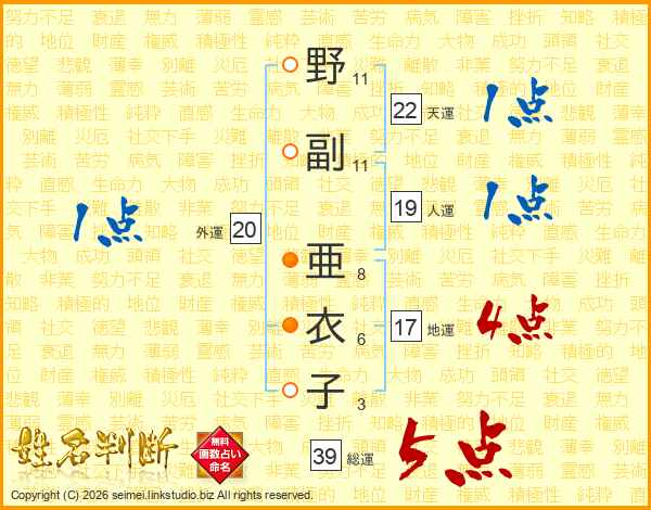 野(11画)副(11画) 亜(8画)衣(6画)子(3画)