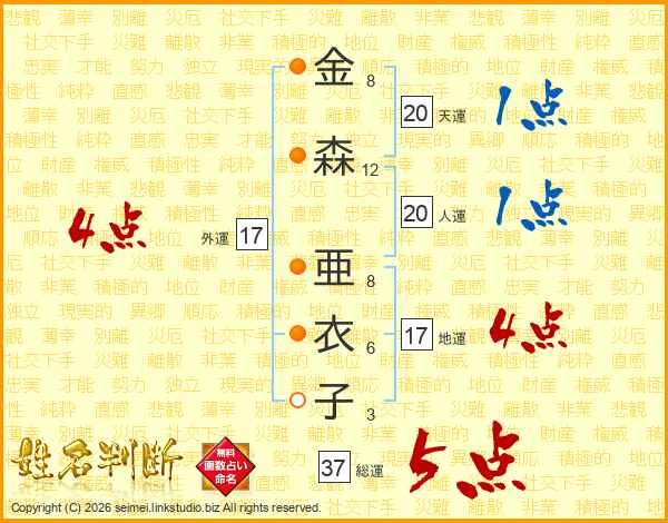 金(8画)森(12画) 亜(8画)衣(6画)子(3画)