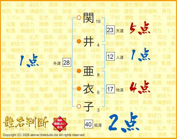 関(19画)井(4画) 亜(8画)衣(6画)子(3画)