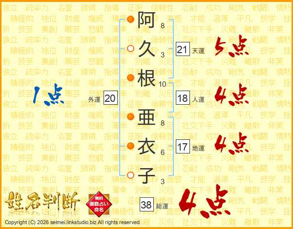 阿(8画)久(3画)根(10画) 亜(8画)衣(6画)子(3画)