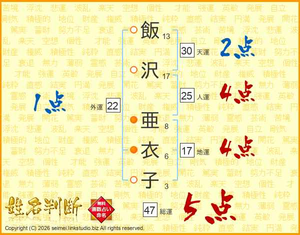 飯(13画)沢(17画) 亜(8画)衣(6画)子(3画)