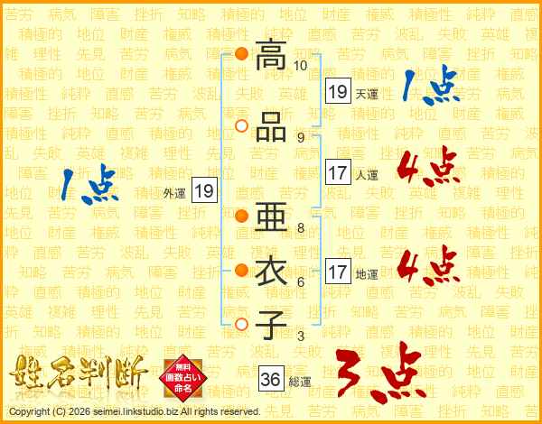 高(10画)品(9画) 亜(8画)衣(6画)子(3画)