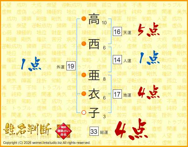 高西亜衣子さんの総運は33画の4点!