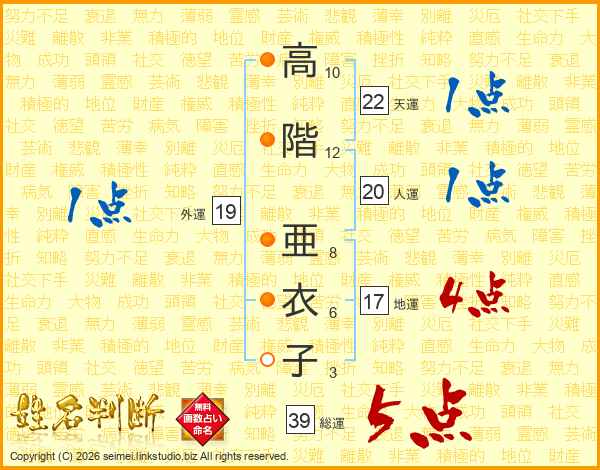 高(10画)階(12画) 亜(8画)衣(6画)子(3画)