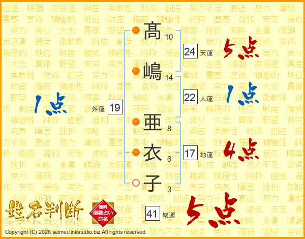 髙(10画)嶋(14画) 亜(8画)衣(6画)子(3画)