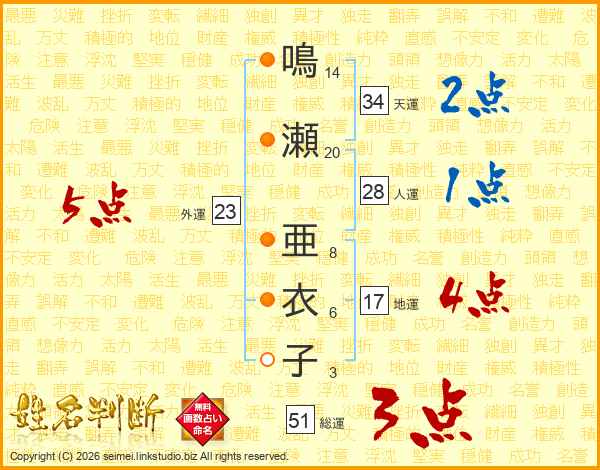 鳴(14画)瀬(20画) 亜(8画)衣(6画)子(3画)