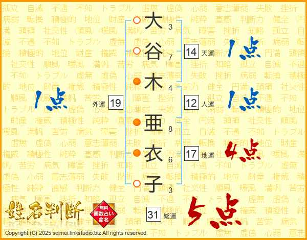 大(3画)谷(7画)木(4画) 亜(8画)衣(6画)子(3画)