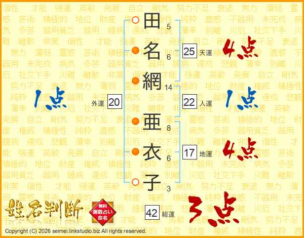 田(5画)名(6画)網(14画) 亜(8画)衣(6画)子(3画)