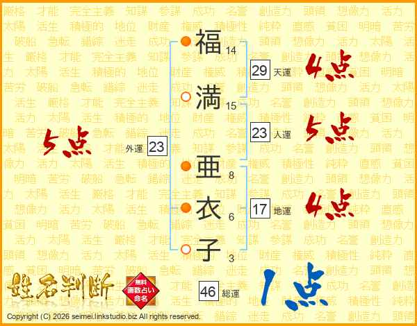 福(14画)満(15画) 亜(8画)衣(6画)子(3画)