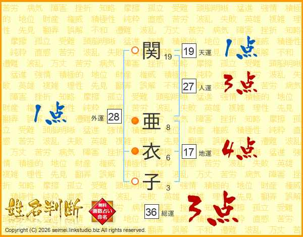 生活面を象徴する運勢です。外部から受ける影響力を表し、結婚運、家庭運や職場、環境への順応性を表します。総運から人運を引いた画数。姓や名が1文字の場合を除く。