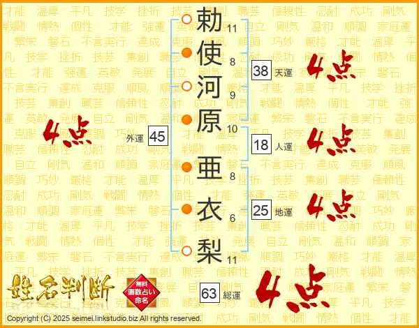 勅(11画)使(8画)河(9画)原(10画) 亜(8画)衣(6画)梨(11画)