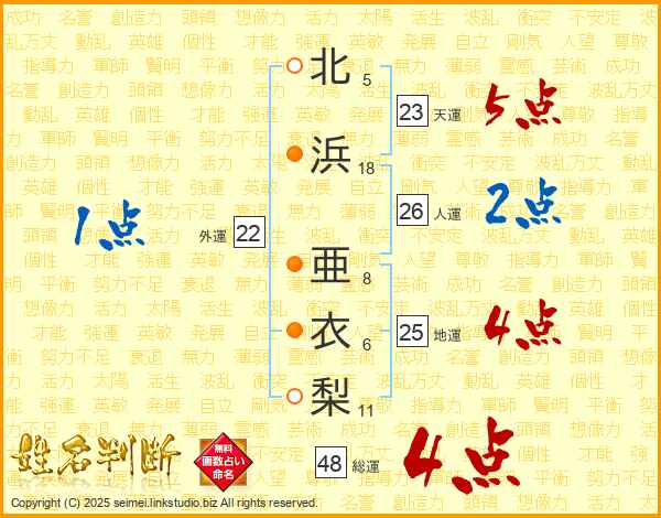 北(5画)浜(18画) 亜(8画)衣(6画)梨(11画)