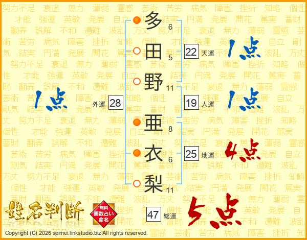 多(6画)田(5画)野(11画) 亜(8画)衣(6画)梨(11画)