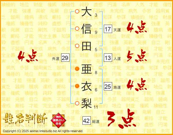 大(3画)信(9画)田(5画) 亜(8画)衣(6画)梨(11画)
