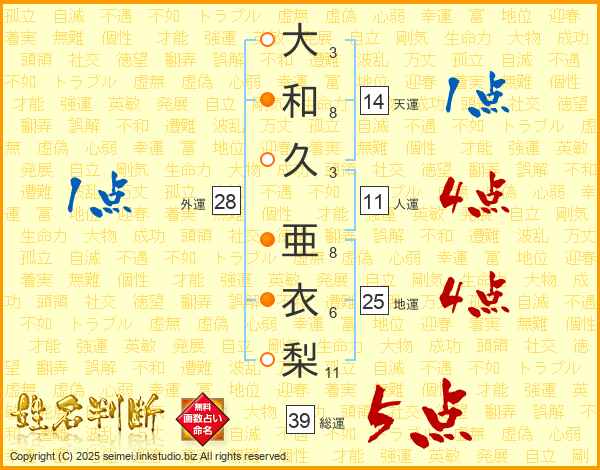大(3画)和(8画)久(3画) 亜(8画)衣(6画)梨(11画)