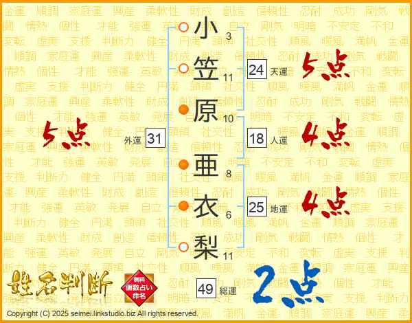 小笠原亜衣梨さんの総運は49画の2点!