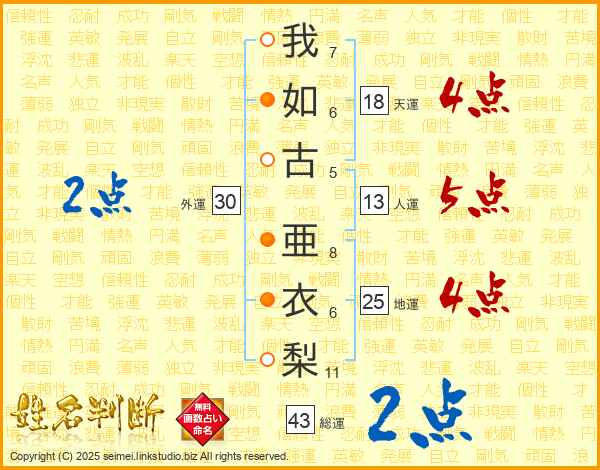 我(7画)如(6画)古(5画) 亜(8画)衣(6画)梨(11画)