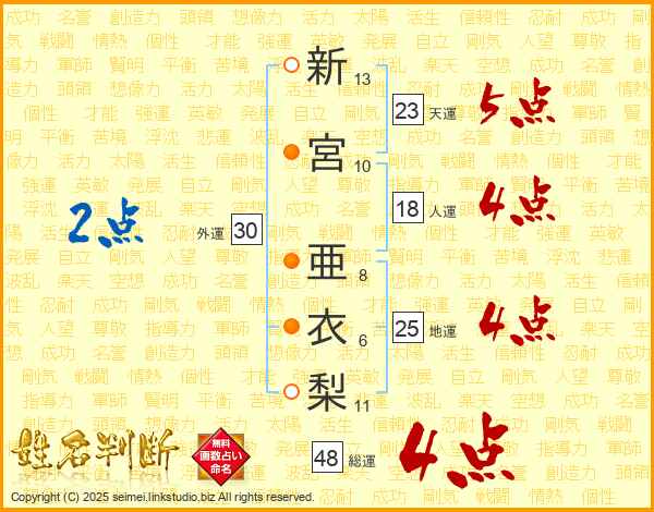 新(13画)宮(10画) 亜(8画)衣(6画)梨(11画)