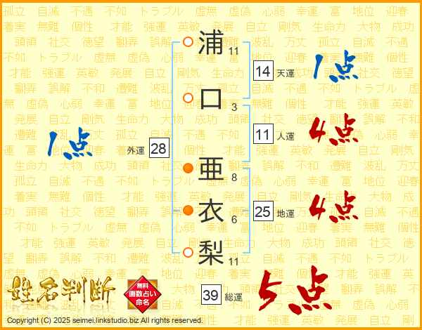 浦(11画)口(3画) 亜(8画)衣(6画)梨(11画)