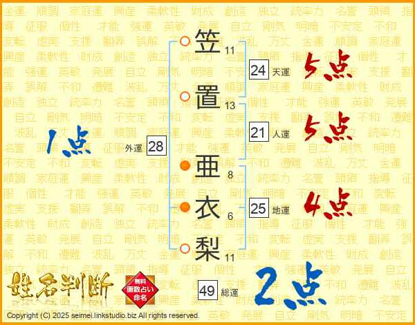 笠(11画)置(13画) 亜(8画)衣(6画)梨(11画)