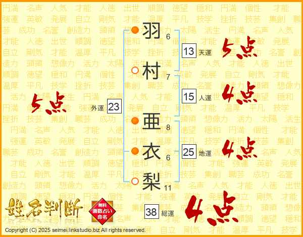 羽(6画)村(7画) 亜(8画)衣(6画)梨(11画)