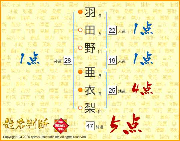 羽(6画)田(5画)野(11画) 亜(8画)衣(6画)梨(11画)