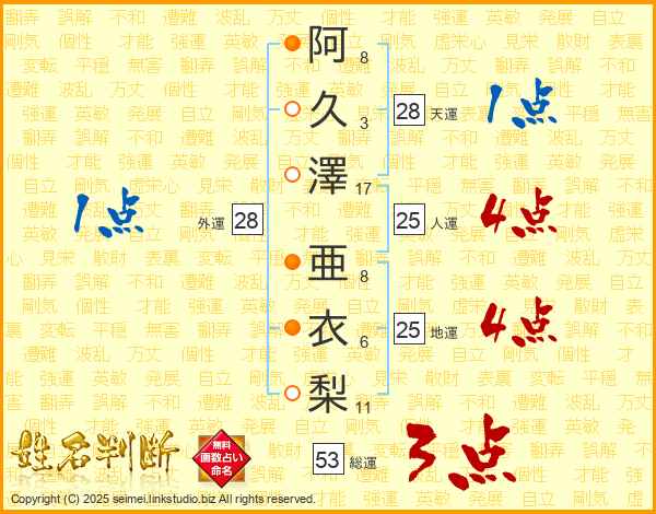 阿(8画)久(3画)澤(17画) 亜(8画)衣(6画)梨(11画)