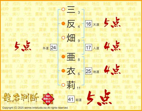 三(3画)反(4画)畑(9画) 亜(8画)衣(6画)莉(11画)