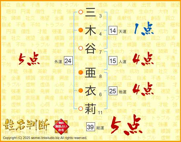 三木谷亜衣莉さんの総運は39画の5点!