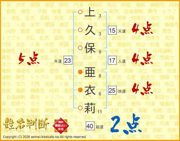 上(3画)久(3画)保(9画) 亜(8画)衣(6画)莉(11画)
