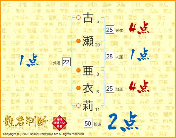 古(5画)瀬(20画) 亜(8画)衣(6画)莉(11画)