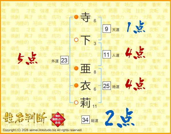 寺(6画)下(3画) 亜(8画)衣(6画)莉(11画)