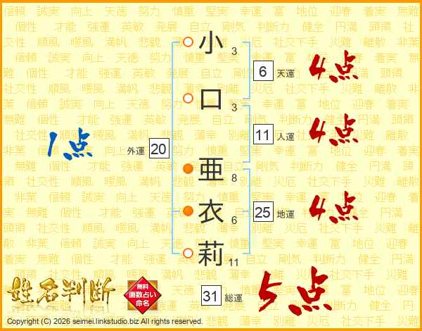 小(3画)口(3画) 亜(8画)衣(6画)莉(11画)