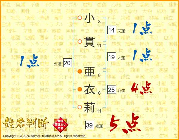 小(3画)貫(11画) 亜(8画)衣(6画)莉(11画)