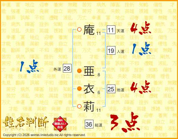 庵(11画) 亜(8画)衣(6画)莉(11画)