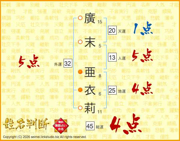 廣末亜衣莉さんの総運は45画の4点!