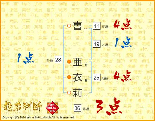 曺亜衣莉さんの総運は36画の3点!