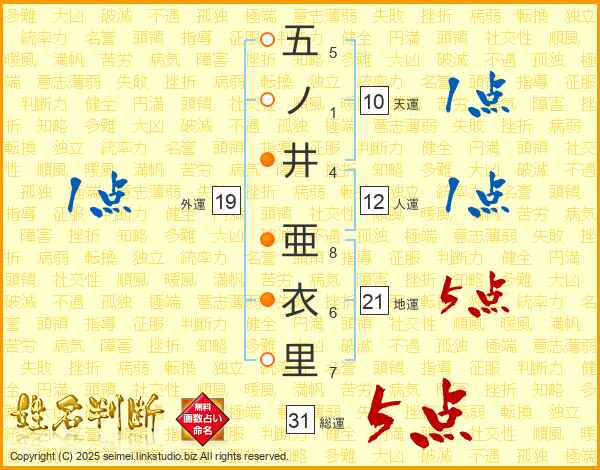 五(5画)ノ(1画)井(4画) 亜(8画)衣(6画)里(7画)