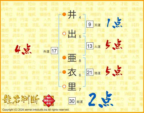 井(4画)出(5画) 亜(8画)衣(6画)里(7画)