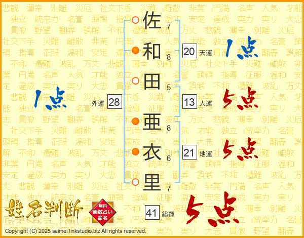 佐(7画)和(8画)田(5画) 亜(8画)衣(6画)里(7画)
