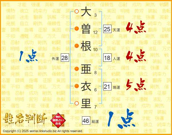 大(3画)曽(12画)根(10画) 亜(8画)衣(6画)里(7画)
