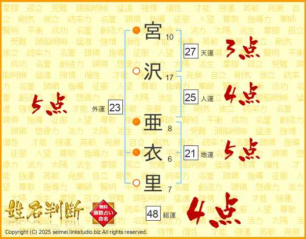 宮(10画)沢(17画) 亜(8画)衣(6画)里(7画)