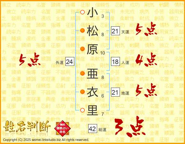小(3画)松(8画)原(10画) 亜(8画)衣(6画)里(7画)