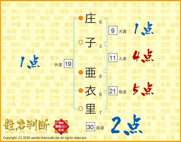庄(6画)子(3画) 亜(8画)衣(6画)里(7画)