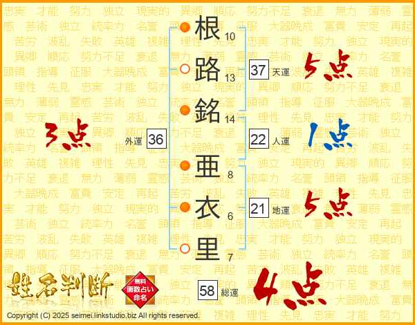 根(10画)路(13画)銘(14画) 亜(8画)衣(6画)里(7画)