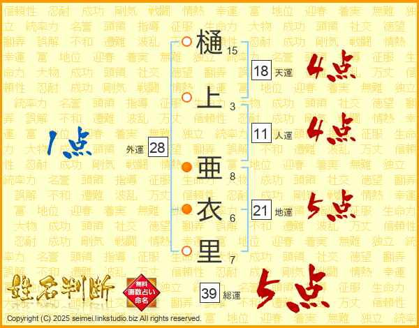 樋(15画)上(3画) 亜(8画)衣(6画)里(7画)
