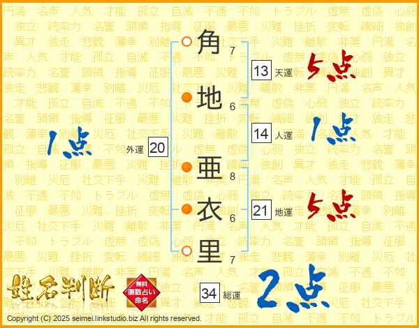 角(7画)地(6画) 亜(8画)衣(6画)里(7画)