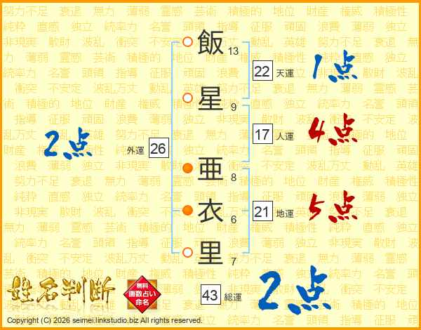 飯星亜衣里さんの総運は43画の2点!